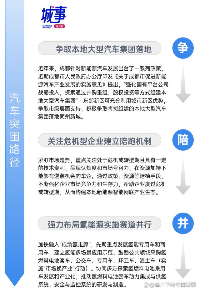 1.爭取本地大型汽車集團(tuán)落地。近年來,成都針對新能源汽車發(fā)展出臺了一系列政策,近期成都印發(fā)《關(guān)于成都市促進(jìn)新能源汽車產(chǎn)業(yè)發(fā)展的實施意見》提出,“強(qiáng)化國有平臺公司戰(zhàn)略投入,探索通過并購重組、股權(quán)投資等方式組建本地大型汽車集團(tuán)”,東部新區(qū)可充分利用城市新區(qū)優(yōu)勢,爭取市級層面支持,積極爭取將擬組建的本地大型汽車集團(tuán)落地簡州新城。