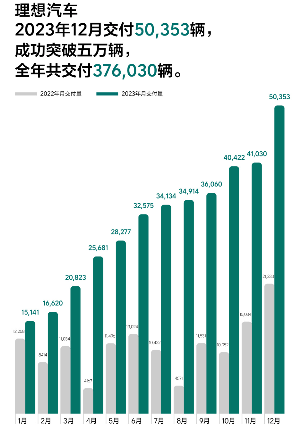 作為新勢力的代表,理想汽車今年表現(xiàn)也同樣亮眼。其公布的數(shù)據顯示,2023年12月,理想汽車交付新車5.04萬輛,同比增長137.1%。這也是理想汽車首次月交付超過5萬大關,兌現(xiàn)了CEO李想此前的承諾。整體來看,理想在2023年累計交付37.6萬輛,同比增長182.2%。截至2023年12月31日,理想汽車累計交付量超60萬輛,是交付量最高的新勢力車企。