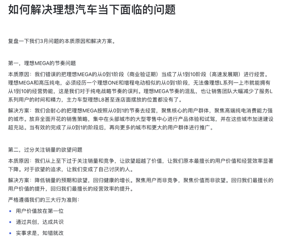 如何解決理想汽車當(dāng)下面臨的問題?李想在全員內(nèi)部信里表示,復(fù)盤了理想3月問題的本質(zhì)原因和解決方案。