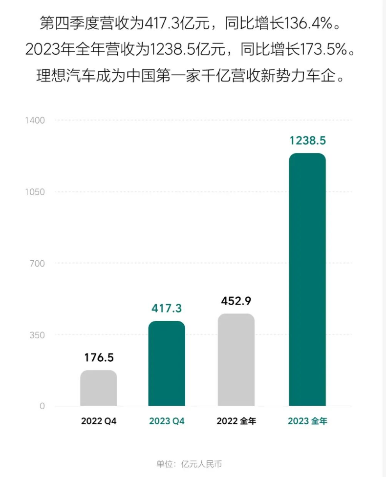 財(cái)報(bào)顯示,理想汽車2023年全年實(shí)現(xiàn)營(yíng)收1238.5億元,同比增長(zhǎng)173.5%,為國(guó)內(nèi)首家營(yíng)收突破千億元的新勢(shì)力車企。2023年凈利潤(rùn)為118.1億元,而2022年凈虧損20.3億元,實(shí)現(xiàn)了自交付以來的全面盈利,成為繼特斯拉、比亞迪之后全球第三家實(shí)現(xiàn)盈利的新能源車企。其中,2023年四季度凈利潤(rùn)為57.5億元,同比增長(zhǎng)2068.2%。