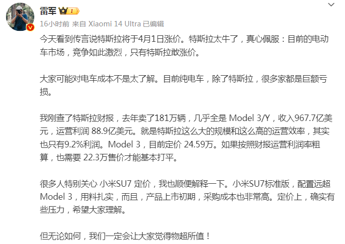 雷軍還提到了小米SU7的定價,他表示:“小米SU7標準版,配置遠超 Model 3,用料扎實,而且,產(chǎn)品上市初期,采購成本也非常高。定價上,確實有些壓力,希望大家理解。”