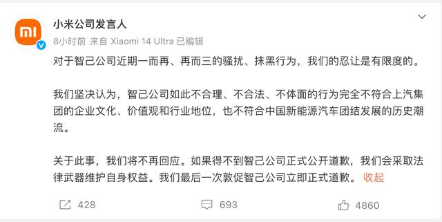 或是前兩條微博未能引起智己重視,4月9日凌晨,小米公司發(fā)言人官微向智己發(fā)出最后通牒,“對于智己公司近期一而再、再而三的騷擾、抹黑行為,我們的忍讓是有限度的。”