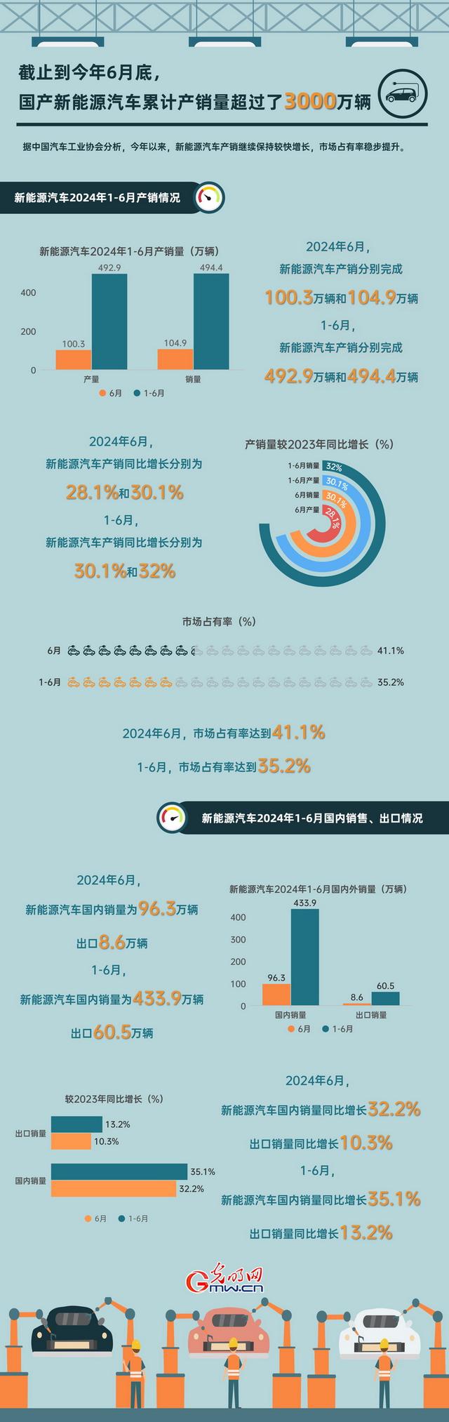 據(jù)中國(guó)汽車工業(yè)協(xié)會(huì)分析,今年以來(lái),新能源汽車產(chǎn)銷繼續(xù)保持較快增長(zhǎng),市場(chǎng)占有率穩(wěn)步提升。根據(jù)協(xié)會(huì)統(tǒng)計(jì),截止到今年6月底,國(guó)產(chǎn)新能源汽車?yán)塾?jì)產(chǎn)銷量超過了3000萬(wàn)輛。