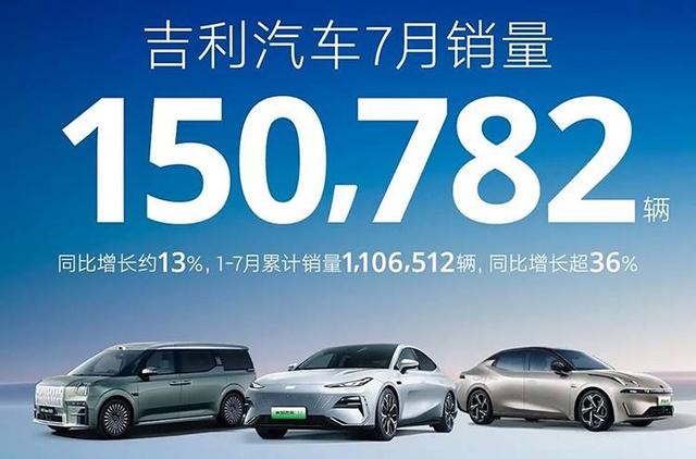 7月,吉利汽車銷量為150782輛,同比增長13%;1-7月累計(jì)銷量1106512輛,同比增長超36%。其中,新能源銷量59051輛,同比增長58%;1-7月新能源累計(jì)銷量379236輛,同比增長105%。