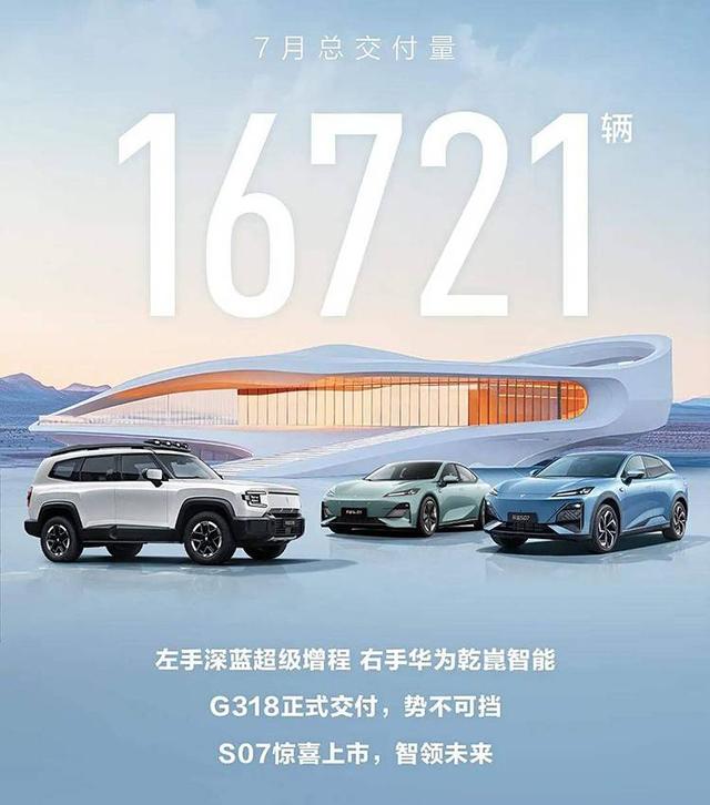 藍(lán)汽車官方宣布,7月累計(jì)共交付16721輛。在7月份,深藍(lán)G318正式開啟交付。深藍(lán)S07也迎來上市,該車共推出10款車型,售價(jià)區(qū)間為14.99-21.29萬元。