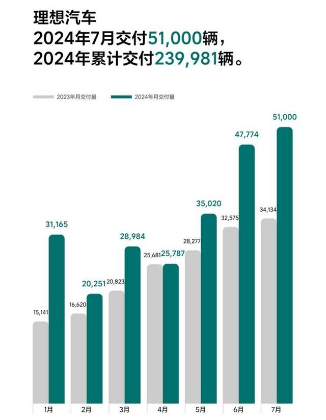 理想汽車在7月交付新車51000輛,創(chuàng)月交付量的歷史新高,同比增長49.4%。今年1-7月,理想共計(jì)交付239981輛。截至2024年7月31日,理想汽車?yán)塾?jì)交付873345輛。