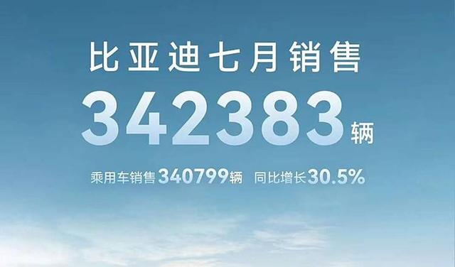 比亞迪官方公布其7月乘用車銷售340799輛,同比增長30.5%,純電車型銷量達(dá)130,000輛,插混車型210,799輛。1-7月,比亞迪乘用車?yán)塾?jì)銷售1,947,944輛,同比增長29.07%。
