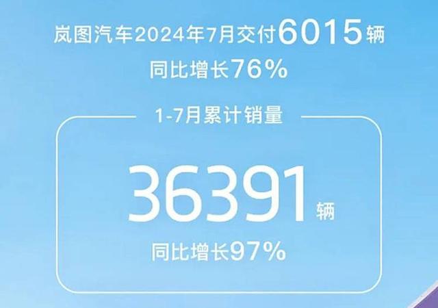 月嵐圖汽車交付6015輛,同比增長76%,1-7月累計(jì)交付36391輛,同比增長97%。