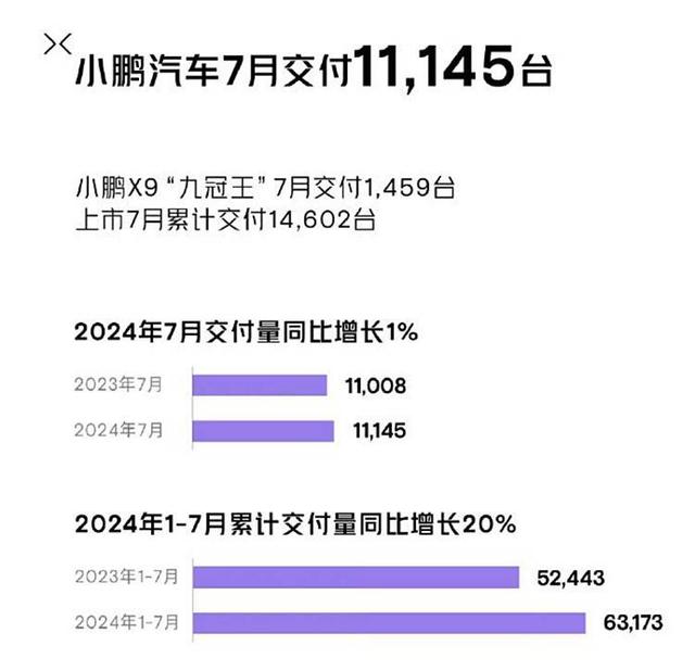 7月小鵬汽車共交付新車11,145臺,同比增長1%,環(huán)比增長4%。1月-7月,小鵬汽車?yán)塾?jì)交付新車共63,173臺,同比增長20%。