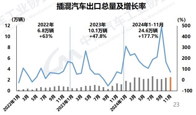 細(xì)分來看,插電式混合動(dòng)力汽車出口增速已遠(yuǎn)超純電動(dòng)汽車。數(shù)據(jù)顯示,1~11月,我國純電動(dòng)汽車出口89.4萬輛,同比下降10.8%;插電式混合動(dòng)力汽車出口24.6萬輛,同比增長1.8倍。其中,11月,純電動(dòng)汽車出口5.8萬輛,環(huán)比下降43.8%,同比下降29.2%;插電式混合動(dòng)力汽車出口2.5萬輛,環(huán)比增長1.9%,同比增長74.3%。