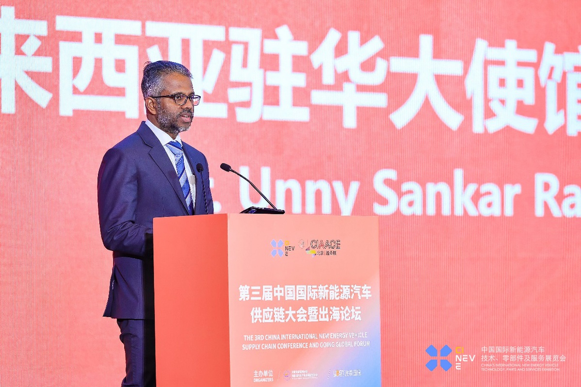 國(guó)家信息中心正高級(jí)經(jīng)濟(jì)師徐長(zhǎng)明先生發(fā)言國(guó)際合作展望:共探出海廣闊前景新能源汽車產(chǎn)業(yè)全球化趨勢(shì)日益明顯,國(guó)際合作與出海發(fā)展成為企業(yè)拓展市場(chǎng)、提升競(jìng)爭(zhēng)力的重要途徑。本環(huán)節(jié)旨在為國(guó)內(nèi)外企業(yè)搭建溝通橋梁,來自7個(gè)國(guó)家的駐華使節(jié)分享各國(guó)新能源汽車產(chǎn)業(yè)的市場(chǎng)機(jī)遇與優(yōu)惠政策,為中國(guó)企業(yè) “走出去” 提供精準(zhǔn)信息,同時(shí)幫助國(guó)外企業(yè)尋求合作,促進(jìn)資源共享與技術(shù)交流,攜手開拓全球市場(chǎng),實(shí)現(xiàn)互利共贏,提升中國(guó)新能源汽車產(chǎn)業(yè)的國(guó)際地位。出海政策:馬來西亞馬來西亞駐華大使館經(jīng)濟(jì)公使Unny Sankar Ravi Sankar先生發(fā)表演講。他高度認(rèn)可中國(guó)在新能源汽車行業(yè)的全球領(lǐng)導(dǎo)地位,期望中國(guó)能與馬來西亞中小企業(yè)分享技術(shù),共同開發(fā)前沿技術(shù),實(shí)現(xiàn)互利共贏。他提到,“一帶一路”
