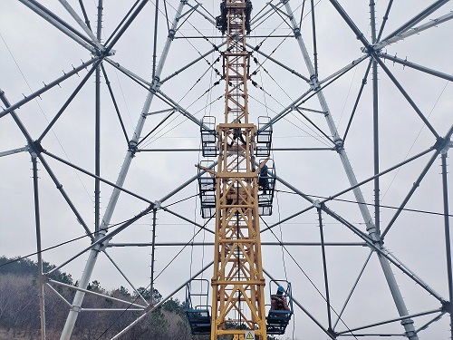 中國電力網(wǎng)訊 12月7日,在湖北紅安縣杏花鄉(xiāng),湖北送變電公司駐馬店一武漢1000千伏特高壓線路工程(6)標(biāo)(3S219號)組塔施工現(xiàn)場, 項(xiàng)目工人正在進(jìn)行抱桿拆卸施工作業(yè)。(劉偉康、郭暉)