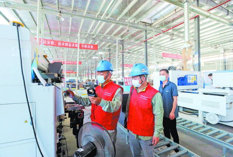 國(guó)家電網(wǎng)湖北電力(孝感)共產(chǎn)黨員服務(wù)隊(duì)隊(duì)員來(lái)到應(yīng)城市一家企業(yè)的生產(chǎn)車(chē)間,幫助企業(yè)檢查用電設(shè)備。