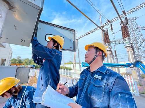 國網(wǎng)河南新鄉(xiāng)供電公司員工冒著40℃的高溫檢修變電設備。