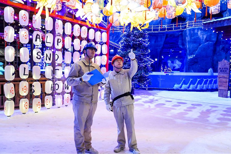 國網(wǎng)江蘇太倉供電公司員工檢查阿爾卑斯雪世界用電設(shè)備。