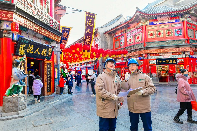 國網(wǎng)天津電力員工在古文化街開展安全用電檢查。