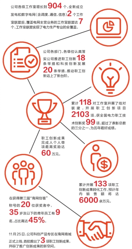 2019年,南方電網(wǎng)公司各部門、各單位認(rèn)真落實(shí)公司推進(jìn)職工創(chuàng)新的18條舉措和科技創(chuàng)新發(fā)展20條舉措,以工作室聯(lián)盟為抓手,進(jìn)一步整合全網(wǎng)職工創(chuàng)新力量,打造了更廣闊的創(chuàng)新協(xié)作平臺(tái),為職工創(chuàng)新創(chuàng)造更好的條件;通過(guò)建章立制、搭建平臺(tái),打通了創(chuàng)新成果轉(zhuǎn)化的“最后一公里”;通過(guò)開展培訓(xùn)、經(jīng)驗(yàn)交流、成果展覽,使優(yōu)秀成果及創(chuàng)新經(jīng)驗(yàn)實(shí)現(xiàn)了共享。今年,公司在職創(chuàng)實(shí)施、項(xiàng)目獲獎(jiǎng)、成果轉(zhuǎn)化等方面,創(chuàng)造了南網(wǎng)職創(chuàng)新高度。