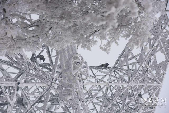 2024年1月,湖北送變電公司員工在湖北隨州市廣水市海拔800多米的牛脊山±800千伏陜武線(xiàn)高空除冰保供電。