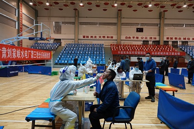 早上8時(shí)起,該廠體育館里工作人員、醫(yī)護(hù)人員和志愿者紛紛忙碌起來,布置采樣桌,擺放電腦,連接網(wǎng)線,檢測區(qū)域設(shè)置一米間隔。體育館外,等待檢測的人員攜帶工作證、身份證排隊(duì),由該廠黨員干部、志愿者組成的引導(dǎo)人員在現(xiàn)場維持秩序,提醒待檢測人員注意間隔、避免扎堆。9時(shí)起,檢測工作正式開始,志愿者引導(dǎo)待檢人員分組進(jìn)入檢測現(xiàn)場、有序進(jìn)行登記,醫(yī)護(hù)人員“全副武裝”,身著防護(hù)服、護(hù)面罩,為大家采集咽拭子。檢測現(xiàn)場設(shè)置十分合理,大家都站在一米間隔線上,隊(duì)伍有序順暢,檢測速度大幅提升。