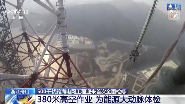 總臺(tái)記者 于晨:我現(xiàn)在所在的位置就是全線四個(gè)架空大跨越線路中規(guī)模最大的一條,位于舟山金塘島一側(cè)的西堠門大跨越的輸電高塔上,整個(gè)塔高380米,一百二三十層樓高,我們從塔底爬到塔頂就花費(fèi)了1個(gè)多小時(shí)。它是目前世界跨海最高的輸電鐵塔,從金塘島到對(duì)岸的冊(cè)子島,共有兩座這樣380米高的輸電鐵塔。