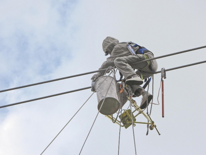 “申請進(jìn)入電場。”得到工作負(fù)責(zé)人許可后,王維國迅速將電位轉(zhuǎn)移棒搭到導(dǎo)線上,一陣電流聲響過后,他抓住導(dǎo)線,順利進(jìn)入電場。地面作業(yè)人員通過傳遞繩將分布式故障診斷裝置傳送至作業(yè)點(diǎn)。王維國接過裝置,開始B相分布式故障診斷裝置的安裝。隨后,他又重新進(jìn)出電場,依次安裝A、C相分布式故障診斷裝置。1小時40分鐘后,分布式故障診斷裝置安裝結(jié)束。(董慶芳 姜棟奎)