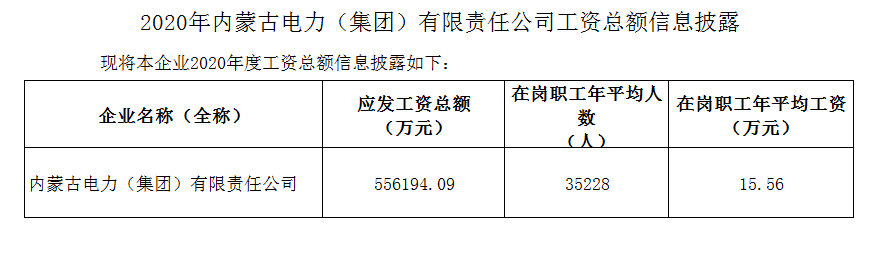 2020年內(nèi)蒙古電力(集團)有限責(zé)任公司工資總額信息披露