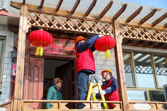 2月6日,國網(wǎng)北京門頭溝供電公司妙峰山供電所員工在炭廠村開展春節(jié)保電走訪,到獨(dú)居老人家檢查“煤改清潔能源”用電設(shè)備,幫助掛紅燈籠。(張文靜 攝)