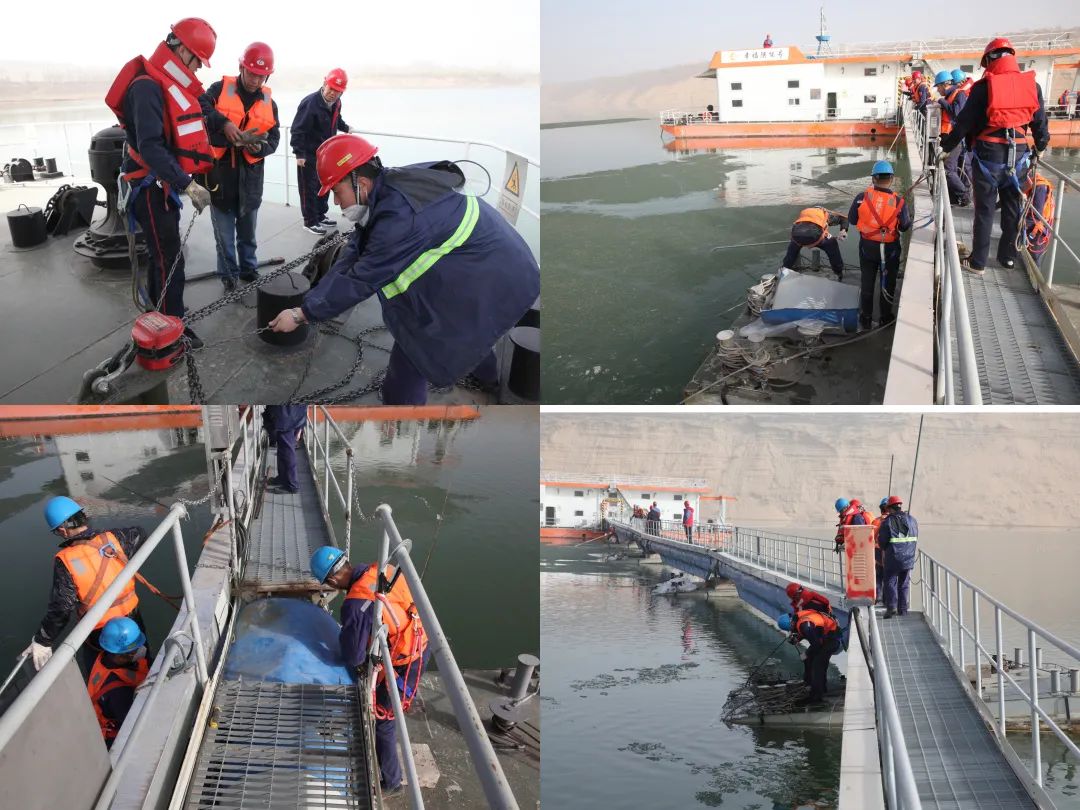 為縮短搶修時(shí)間,大家明確分工,多點(diǎn)開花,除冰、接頭檢查、浮橋踏步修正、護(hù)欄軟連接鏈條修正、泵船錨鏈調(diào)整等各項(xiàng)工作同步開展。大風(fēng)無情人有情,搶修組選擇就地用餐,后勤組按時(shí)按點(diǎn)送來營養(yǎng)豐富的加班餐,大家吃在嘴里,暖在心里。生產(chǎn)副總經(jīng)理組織各項(xiàng)具體搶修工作,制定搶修工作方案,協(xié)調(diào)管線試用,全力確保用水安全可靠。