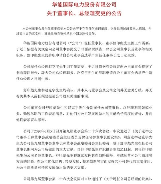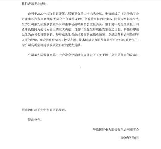 中國(guó)電力網(wǎng)訊 3月5日,華能?chē)?guó)際電力股份有限公司發(fā)布公告,因工作需要,現(xiàn)任董事長(zhǎng)、董事舒印彪和現(xiàn)任總經(jīng)理趙克宇于近日提交書(shū)面辭職報(bào)告,辭去相關(guān)職務(wù)。當(dāng)日,公司董事會(huì)同意選舉趙克宇為公司第九屆董事會(huì)董事長(zhǎng)和董事會(huì)戰(zhàn)略委員會(huì)主任委員。