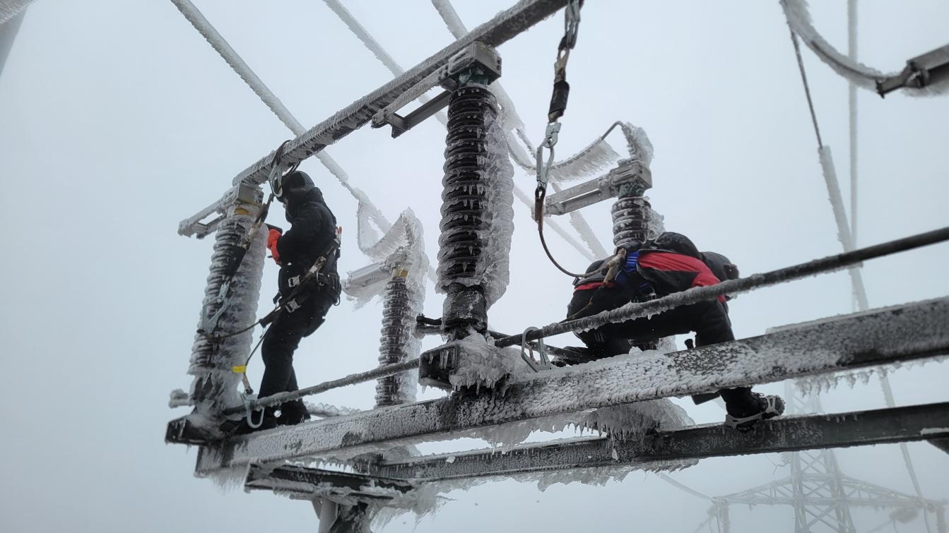 圖為湖南公司黃甲嶺風(fēng)電場(chǎng)運(yùn)維人員在刀閘上進(jìn)行除冰操作