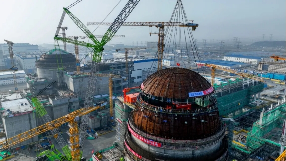 4月15日上午7點(diǎn)39分,田灣核電8號(hào)機(jī)組穹頂球冠順利就位,歷時(shí)2小時(shí)20分鐘。2000噸履帶式吊車(chē)緩緩將重量208.84噸的球冠吊離地面,經(jīng)過(guò)起鉤、順時(shí)旋轉(zhuǎn)、行走、提升、逆時(shí)旋轉(zhuǎn)等一系列精準(zhǔn)的動(dòng)作后,最后平穩(wěn)落鉤就位于穹頂球帶上。球冠和球帶合為一體,成為保護(hù)核反應(yīng)堆的重要屏障。