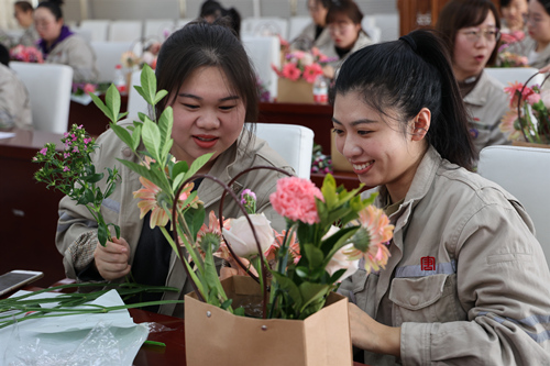 活動中,花藝老師對各類鮮花的花語作了闡釋,并對插花的特點、創(chuàng)意、養(yǎng)護要點進行了講解,現(xiàn)場演示了插花的過程。女職工們在老師的指導下,親自動手嘗試修剪枝葉、搭配色彩,挑花、剪接、選位、調整,精心制作插花作品?;顒蝇F(xiàn)場芬芳四溢、氣氛溫馨,使女職工放松身心,專注于花朵的世界,經(jīng)過精心的修飾,一盆盆令人賞心悅目的花籃,在女職工們的巧手下化身為精致的作品,一枝花、一棵草,變得詩情畫意、格調高雅、清新怡人。
