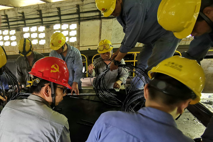 P106B膠帶整體更換膠帶全長2300米,共需硫化接頭20個,是整個輸煤系統(tǒng)膠帶更換工作中最難啃的一塊"硬骨頭"。為確保此次膠帶更換工作順利完成,該公司多次召開檢修專題討論會,制定了組織、安全、技術(shù)措施及詳細(xì)的施工方案,成立兩個硫化組,一個物資保障收放組,實行24小時輪班作業(yè),保證施工的持續(xù)性和連貫性。針對舊膠帶的拆除、拖拽、新膠帶的吊裝、鋪設(shè)等施工難點,創(chuàng)新工作思路,開展技術(shù)攻關(guān)破解難題,自制了自動卷帶機,減少了人工投入,極大提高了工作效率,特別是在攻克硫化接頭方面,嚴(yán)格施工標(biāo)準(zhǔn)和工藝流程操作,經(jīng)過斷帶、剝鋼絲繩、芯膠面膠鋪整、硫化機緊固、加壓、加熱、再進(jìn)行保溫降溫等施工程序,每個頭用時8多個小時,做到精益求精,確保一次硫化成功,保證硫化質(zhì)量。