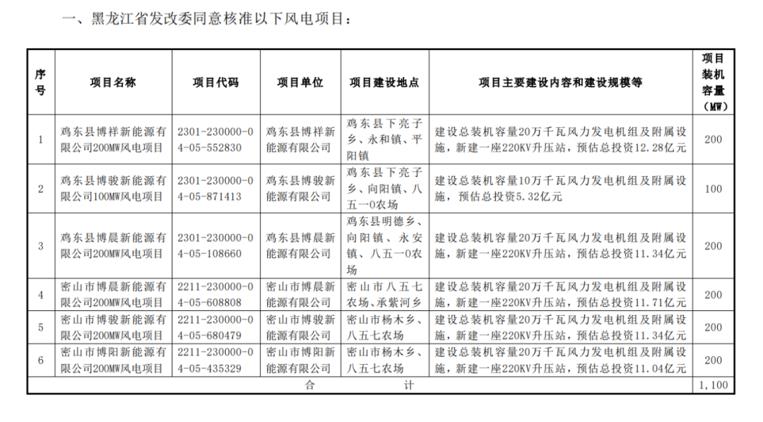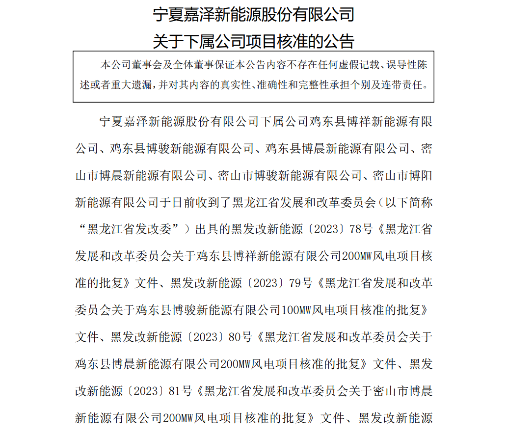 公告披露,寧夏嘉澤新能源股份有限公司下屬公司于日前收到了黑龍江省發(fā)展和改革委員會(以下簡稱“黑龍江省發(fā)改委”)出具的風(fēng)電項目核準的批復(fù)文件,共計六個風(fēng)電項目獲得核準,總裝機容量為1100MW。