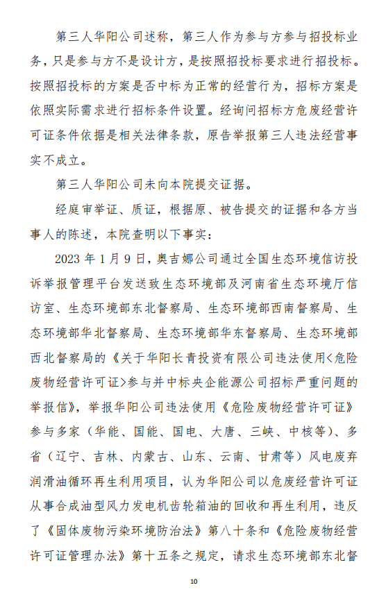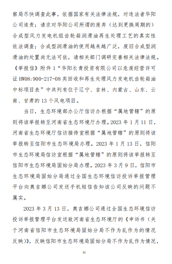 2023年3月9日,奧吉娜公司收到固始分局通過(guò)12369環(huán)境信訪平臺(tái)的短信答復(fù):“反映問(wèn)題不屬實(shí)”。3月10日,奧吉娜公司向固始分局負(fù)責(zé)人電話詢問(wèn),其解釋稱:經(jīng)調(diào)查核實(shí),華陽(yáng)長(zhǎng)青公司沒(méi)有再生風(fēng)電潤(rùn)滑油銷售,出售的是新油。否定了奧吉娜公司的舉報(bào)內(nèi)容。對(duì)此,奧吉娜公司表示強(qiáng)烈不滿。3月11日,奧吉娜公司向環(huán)境部投訴固始分局的不作為和亂作為。2023年5月26日,奧吉娜公司收到12369環(huán)境信訪平臺(tái)的短信答復(fù)。答復(fù)部門為信陽(yáng)環(huán)境局。令人啼笑皆非的是,答復(fù)稱,華陽(yáng)長(zhǎng)青的許可證有效期沒(méi)有問(wèn)題,與舉報(bào)內(nèi)容風(fēng)馬牛不相及。2023年6月13日,奧吉娜公司再次向環(huán)境部提出申訴,指出,奧吉娜舉報(bào)的不是許可證有效期問(wèn)題,而是許可證的適用范圍錯(cuò)誤、違法。2023年7月27日,奧吉娜公司收到回復(fù)稱,經(jīng)信陽(yáng)市生態(tài)環(huán)境局現(xiàn)場(chǎng)檢查,未發(fā)現(xiàn)固始分局不作為情況。2023年8月3日,奧吉娜公司向河南省生態(tài)環(huán)境廳(以下稱:環(huán)境廳)舉報(bào)信陽(yáng)環(huán)境局包庇固始分局的行為。環(huán)境廳對(duì)此高度重視,有關(guān)處長(zhǎng)和奧吉娜公司負(fù)責(zé)人進(jìn)行了面談。2023年9月13日,信陽(yáng)環(huán)境局向奧吉娜公司致《信陽(yáng)市生態(tài)環(huán)境局關(guān)于沈陽(yáng)奧吉娜化工有限公司舉報(bào)華陽(yáng)長(zhǎng)青投資有限公司違法經(jīng)營(yíng)及固始分局不作為、亂作為等問(wèn)題調(diào)查處理的函》。函中:一是,以“齒輪箱”替換“齒輪箱油”,偷換概念;二是,做出了廢風(fēng)電合成(齒輪)油不屬于危險(xiǎn)廢物的結(jié)論;三是,未發(fā)現(xiàn)固始分局存在不作為、亂作為的不當(dāng)行為。再次否定奧吉娜公司的舉報(bào)和投訴。