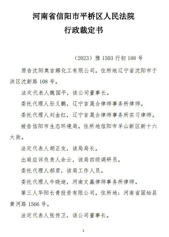 本網(wǎng)訊 中國(guó)風(fēng)電潤(rùn)滑油龍頭企業(yè)沈陽(yáng)奧吉娜化工有限公司(下簡(jiǎn)稱:奧吉娜公司或原告)訴信陽(yáng)市生態(tài)環(huán)境局(被告)和第三人華陽(yáng)長(zhǎng)青投資有限公司(下簡(jiǎn)稱:華陽(yáng)長(zhǎng)青公司)行政訴訟案,河南省信陽(yáng)市平橋區(qū)人民法院于2023年12月29日作出行政裁定:駁回原告沈陽(yáng)奧吉娜化工有限公司的起訴。