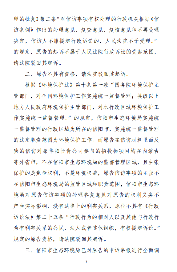 法院的裁定理由是:被告的《信陽(yáng)市生態(tài)環(huán)境局關(guān)于沈陽(yáng)奧吉娜化工有限公司舉報(bào)華陽(yáng)長(zhǎng)青投資有限公司違法經(jīng)營(yíng)及固始分局不作為、亂作為的問(wèn)題調(diào)查處理函》(下稱《調(diào)查處理函》)與原告訴請(qǐng)沒(méi)有利害關(guān)系,因此,原告沒(méi)有訴訟資格,下附一:《河南省信陽(yáng)市平橋區(qū)人民法院行政裁定書》(18頁(yè))。