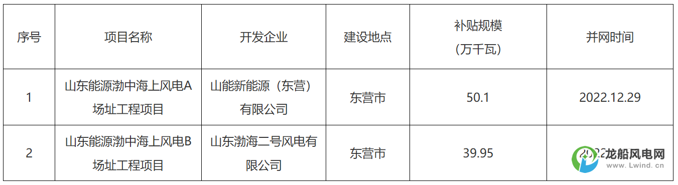 公告顯示,山東省能源局結(jié)合《山東省海上風(fēng)電財政補貼實施細則》有關(guān)規(guī)定,組織專家組對東營市上報的2022年度建成并網(wǎng)海上風(fēng)電項目財政補貼申請材料進行了復(fù)審。經(jīng)復(fù)審,東營市上報的兩個海上風(fēng)電項目補貼申請材料符合要求,項目基本信息及補貼規(guī)模公示如下: