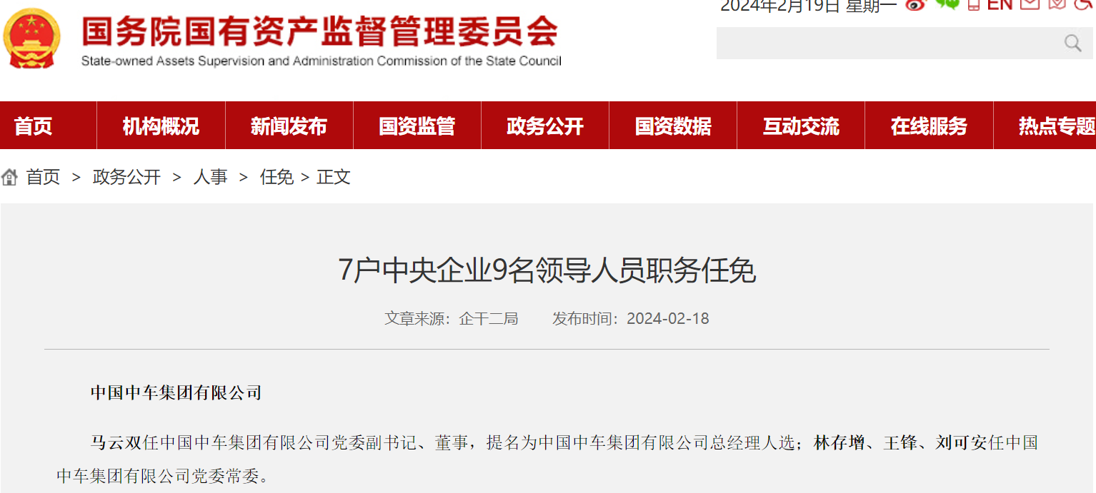 2月18日,國(guó)資委發(fā)布7戶中央企業(yè)9名領(lǐng)導(dǎo)人員職務(wù)任免。