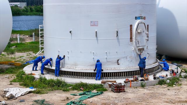 目前全球已經(jīng)開始安裝的最大功率等級海上風(fēng)電機(jī)組正在廣東省臨海試驗(yàn)基地進(jìn)行塔筒吊裝。潘軍 攝