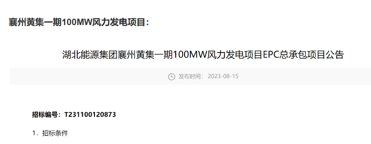 公告顯示,襄州黃集一期100MW風(fēng)力發(fā)電項目位于湖北省襄陽市襄州區(qū)黃集鎮(zhèn)境內(nèi),裝機規(guī)模100MW,安裝20臺單機容量為5000kW風(fēng)力發(fā)電機組,擬新建220kV升壓站一座。