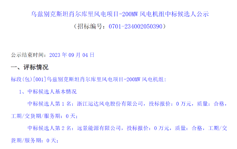 近日,中國(guó)招標(biāo)投標(biāo)公共服務(wù)平臺(tái)發(fā)布《烏茲別克斯坦肖爾庫(kù)里風(fēng)電項(xiàng)目-200MW風(fēng)電機(jī)組中標(biāo)候選人公示》的公告。