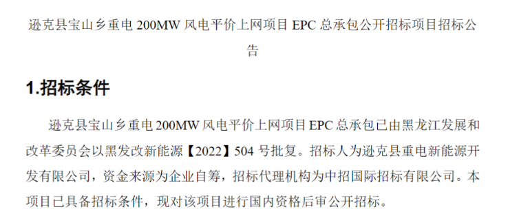 公告顯示,遜克縣寶山鄉(xiāng)重電200MW風(fēng)電平價(jià)上網(wǎng)項(xiàng)目位于黑龍江省黑河市遜克縣寶山鄉(xiāng)境內(nèi),場(chǎng)址中心距遜克縣城直線(xiàn)距離約50km,規(guī)劃裝機(jī)總?cè)萘繛?00MW,一次性建設(shè)完成,風(fēng)電場(chǎng)擬安裝32臺(tái)H193-6.25MW機(jī)型。