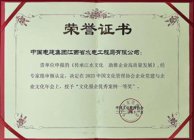中國電力網(wǎng)訊 (通訊員 趙勇) 日前,2023中國文化管理協(xié)會企業(yè)黨建與企業(yè)文化年會在杭州舉辦。中國電建集團江西省水電工程局有限公司(以下簡稱“江西水電”)申報的《傳承江水文化 助推企業(yè)高質(zhì)量發(fā)展》案例獲評中國文化管理協(xié)會“文化強企優(yōu)秀案例一等獎”,申報的《企業(yè)文化手冊》獲評“最美品牌之聲”銀獎代言作品。這是繼獲評全國工程建設(shè)行業(yè)企業(yè)文化最佳案例之后,又一次獲獎。