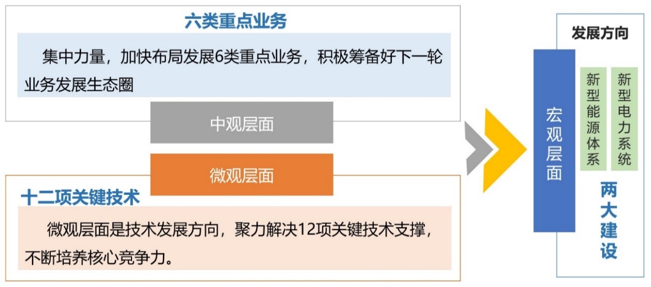 科學(xué)規(guī)劃新質(zhì)生產(chǎn)力發(fā)展方向,制定發(fā)展新質(zhì)生產(chǎn)力的陜西院方案,是保障新質(zhì)生產(chǎn)力發(fā)展的重要前提。陜西院基于自身資源稟賦及發(fā)展優(yōu)勢,從三個(gè)層面系統(tǒng)性提出新質(zhì)生產(chǎn)力業(yè)務(wù)發(fā)展規(guī)劃,制定了發(fā)展新質(zhì)生產(chǎn)力的陜西院方案:宏觀層面是方向指引,要堅(jiān)持立足構(gòu)建新型能源體系與構(gòu)建新型電力系統(tǒng),主動(dòng)履行央企責(zé)任擔(dān)當(dāng);中觀層面是業(yè)務(wù)發(fā)展方向,要集中力量,加快布局發(fā)展6類重點(diǎn)業(yè)務(wù),積極籌備好下一輪業(yè)務(wù)發(fā)展生態(tài)圈;微觀層面是技術(shù)發(fā)展方向,要聚力解決12項(xiàng)關(guān)鍵技術(shù)支撐,不斷培養(yǎng)核心競爭力。