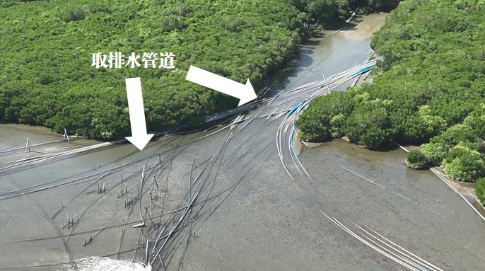 ▲圖5 2023年11月22日,督察組現(xiàn)場督察使用無人機(jī)拍攝,養(yǎng)殖塘取排水設(shè)施穿越清瀾紅樹林省級(jí)自然保護(hù)區(qū)核心區(qū)
