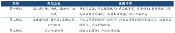 國(guó)內(nèi)膜法水處理行業(yè)公司可劃分為國(guó)際領(lǐng)先企業(yè),國(guó)內(nèi)領(lǐng)先企業(yè)和國(guó)內(nèi)小型企業(yè)三個(gè)梯隊(duì)