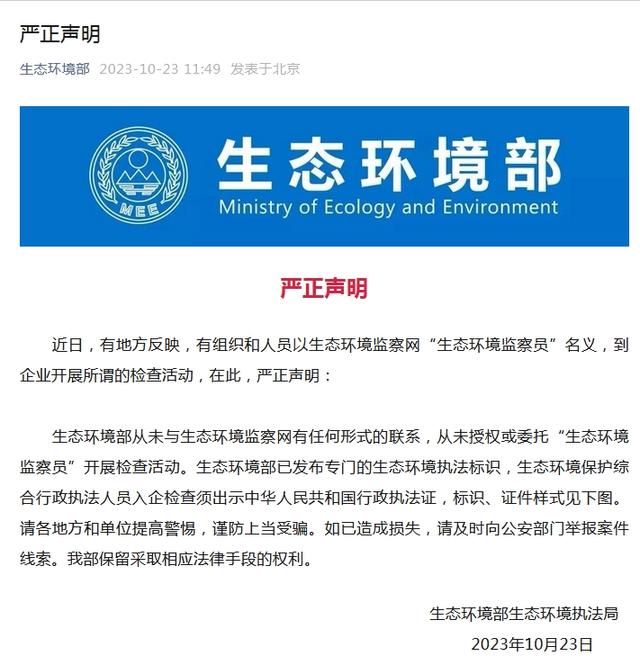 據(jù)生態(tài)環(huán)境部公眾號10月23日消息,近日,有地方反映,有組織和人員以生態(tài)環(huán)境監(jiān)察網(wǎng)“生態(tài)環(huán)境監(jiān)察員”名義,到企業(yè)開展所謂的檢查活動,在此,生態(tài)環(huán)境部嚴(yán)正聲明: