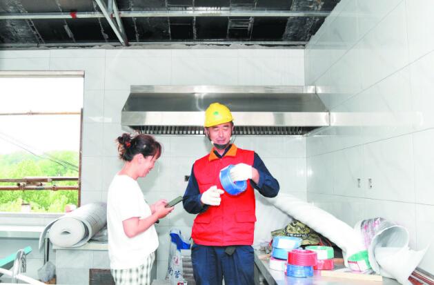 楊棟(右)義務幫助獐島村漁家樂采買電器并安裝。陳薪成 攝