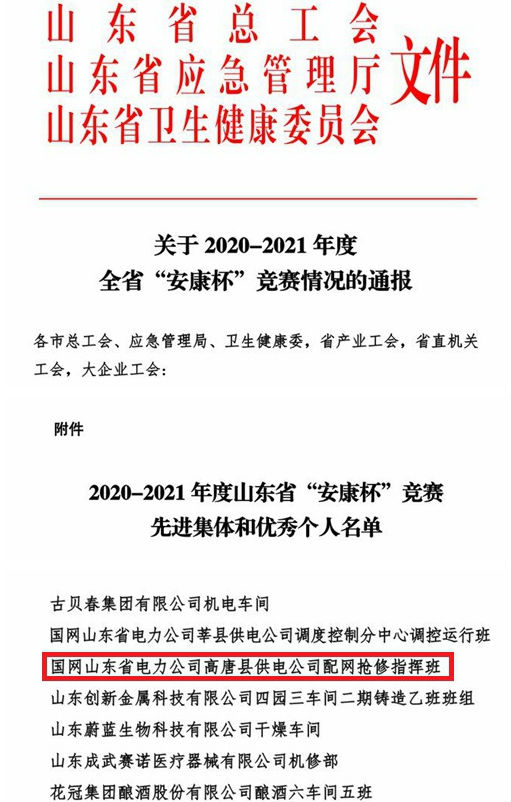 近日,從山東省總工會獲悉,高唐公司配網(wǎng)搶修指揮班獲評2020-2021年度全省“安康杯”競賽優(yōu)勝班組,全省共評選出60個(gè)班組,其中供電系統(tǒng)共有5個(gè)班組獲此殊榮。